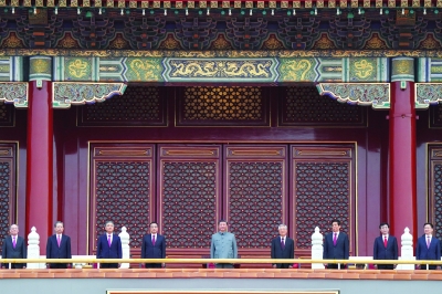 上午7时53分,在欢快的乐曲声中,习近平等党和国家领导人来到天安门城楼主席台,全场爆发出热烈掌声。