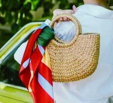 搭配连身裙/半裙。穿白色连衣裙时,需要一些有色彩、有立体形状的配饰来点缀,没有什么比草编包更合适了。还可将丝巾系在包包手柄上,复古之余又不失时髦感。碎花的颜色偏繁杂,可用纯色草编包搭配。