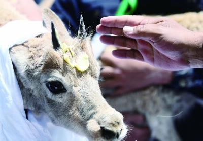 ▲ 7月7日,在可可西里索南达杰保护站野生动物救助中心,可可西里巡山队员按照风俗,在藏羚羊额头上涂抹酥油表达祝福。