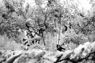 近日,四川省华蓥市天池镇仁和村果农杨正茹(右)带领村民采摘“青脆李”。