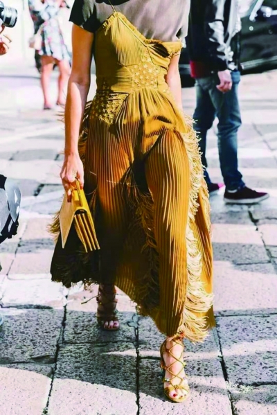 裙子。褶皱和裙子是天生的黄金CP,能瞬间丰富层次感,提高时髦度。蘑菇褶连衣裙因为紧密贴合身体线条,即使H型身材穿着也能放大曲线感,很优雅。蘑菇褶最适合用在各种纱质和丝质连衣裙上,原本这两种材质尽显温柔浪漫气质,再加上细细密密的蘑菇褶皱,更有女人味。