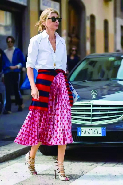 上衣。衬衫式褶皱上衣穿起来很有时尚感,对身材修饰感也很强。多色设计的组合,看起来也更丰盈。比起单调的针织衫,这种不平整又微透的上衣更能打造慵懒又复古的少女感。而且有一点厚度的褶皱带有一些膨胀感,身材单薄的人刚好可用此来打造丰满上身。也不要害怕选择亮色,夏天穿个亮色蘑菇褶上衣正好是全身亮点。