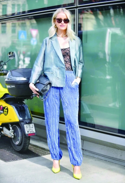 套装。褶皱套装穿起来简约大方,一点不用担心会“踩雷”。蓝色蘑菇褶套装,看似随性自在,又很有复古感,尤其是袖口和裤脚都是伞状褶皱袖口,举手投足间还增加了衣服的飘逸动感。