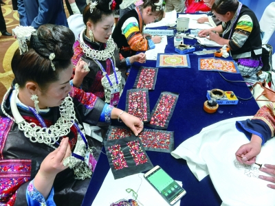在主题论坛现场,专门设立了“锦绣生态美”专题展,色彩旖旎的蜡染服装、巧夺天工的刺绣作品、独具匠心的银饰,吸引了众多参会者的目光。