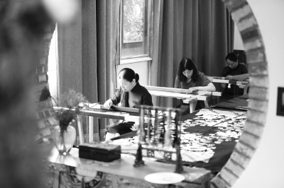 7月18日,隆尧县北楼乡一家服装企业,工作人员在绣制京绣产品。 近年来,河北省邢台市隆尧县大力推进服装产业转型升级,鼓励当地企业引进京绣等传统技艺,发展旗袍、手工刺绣等非遗文化产品,并免费为当地留守妇女提供刺绣技能培训,在促进服装产业发展的同时,推动了传统非遗技艺的传承。