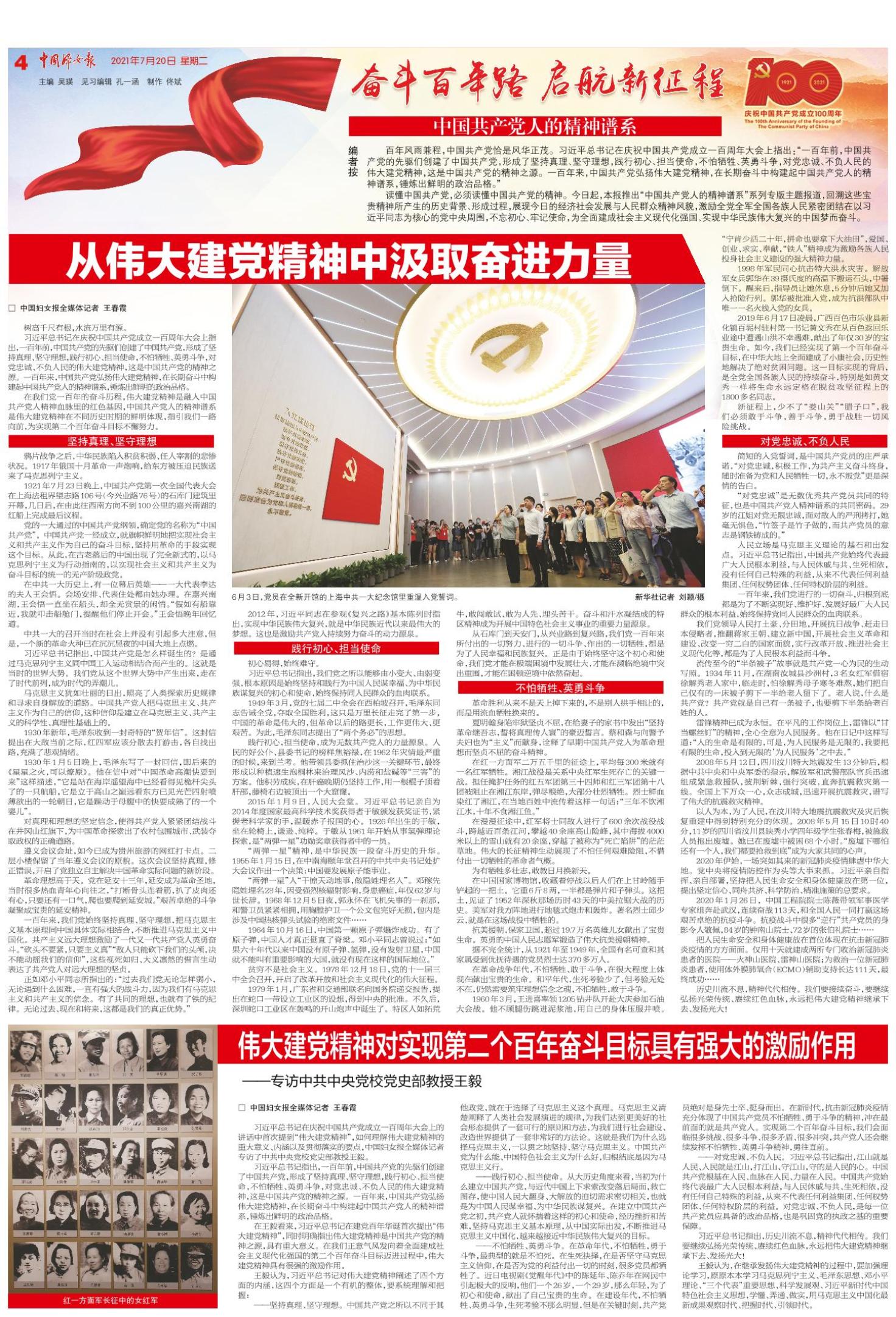 习近平总书记在庆祝中国共产党成立一百周年大会上的讲话中首次提到“伟大建党精神”,如何理解伟大建党精神的重大意义、内涵以及贯彻落实的要点,中国妇女报全媒体记者专访了中共中央党校党史部教授王毅。