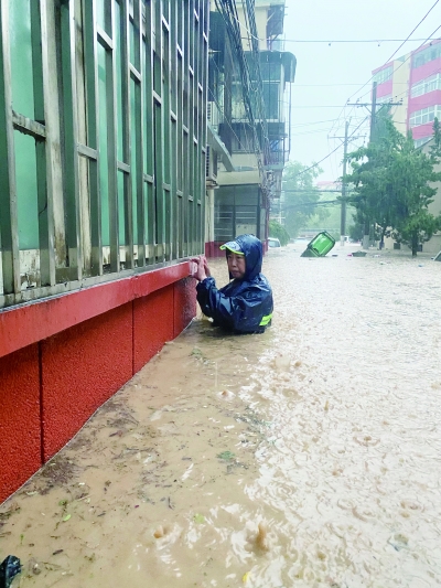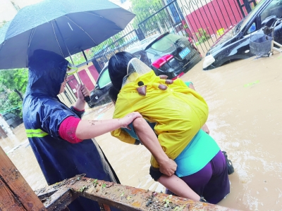 ◀ 7月20日下午,郑州市中原区汝河路街道办事处市委社区党委书记、主任樊津瑜扒着窗户挨家挨户通知居民撤离。