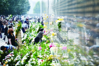 7月28日,市民在唐山地震遗址纪念公园的纪念墙前献花。 当日是唐山大地震45周年。连日来,许多市民来到唐山地震遗址纪念公园,在纪念墙前献上鲜花,缅怀地震罹难者。 新华社记者 牟宇/摄