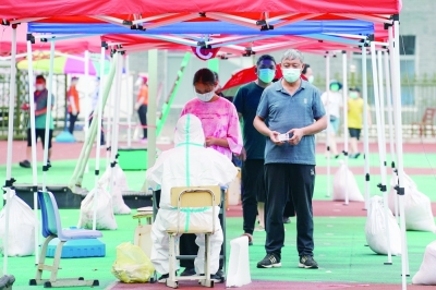 8月9日,市民在扬州市广陵区汶河街道龙头关社区育才小学采样点登记信息,准备进行核酸检测取样。