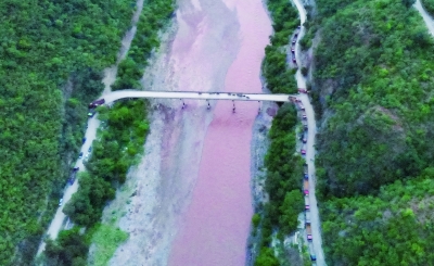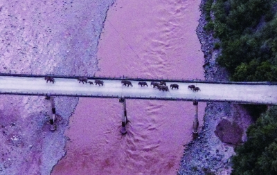 象群通过老213国道元江桥(无人机照片,8月8日摄)。记者从国家林草局北移大象处置工作指导组了解到,8日20时许,云南北移亚洲象群14头大象已跨过元江,平安回归适宜栖息地。 新华社发