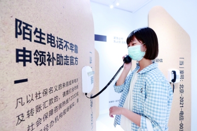 ▲ 参观者在北京举行的沉浸式防骗展上观看防骗语录。