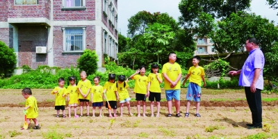 8月15日,黄炳洪给11个孩子讲授如何种菜。    每年夏天,福建莆田城厢区榜头村村民黄炳洪的孙辈们都会聚集到村里,在老人的带领下过暑假。如今,60岁的黄炳洪已有孙辈11人,年龄最大的12岁,最小的16个月。作为一名退伍老兵,黄炳洪喜欢整齐划一。他给11个孩子穿上统一的服装,按编号排列,一方面希望孩子从小就能养成遵守纪律的习惯,另一方面来客也容易辨认他们。