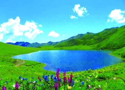 5:30左右,天际发白,脚下的野花影影绰绰。我们关了头灯,屏住呼吸,凝视东方。突然天地间霞光万道,太阳却终究在日出的刹那间又被云层挡住了,只留下因阳光反射而闪闪发光的金山。云海茫茫、霞光四射是九顶山景观的常态。此时俯瞰黑龙潭,高山上的湖泊像一枚心形的碧钻,静静镶嵌在长满鲜花的高山草甸上。