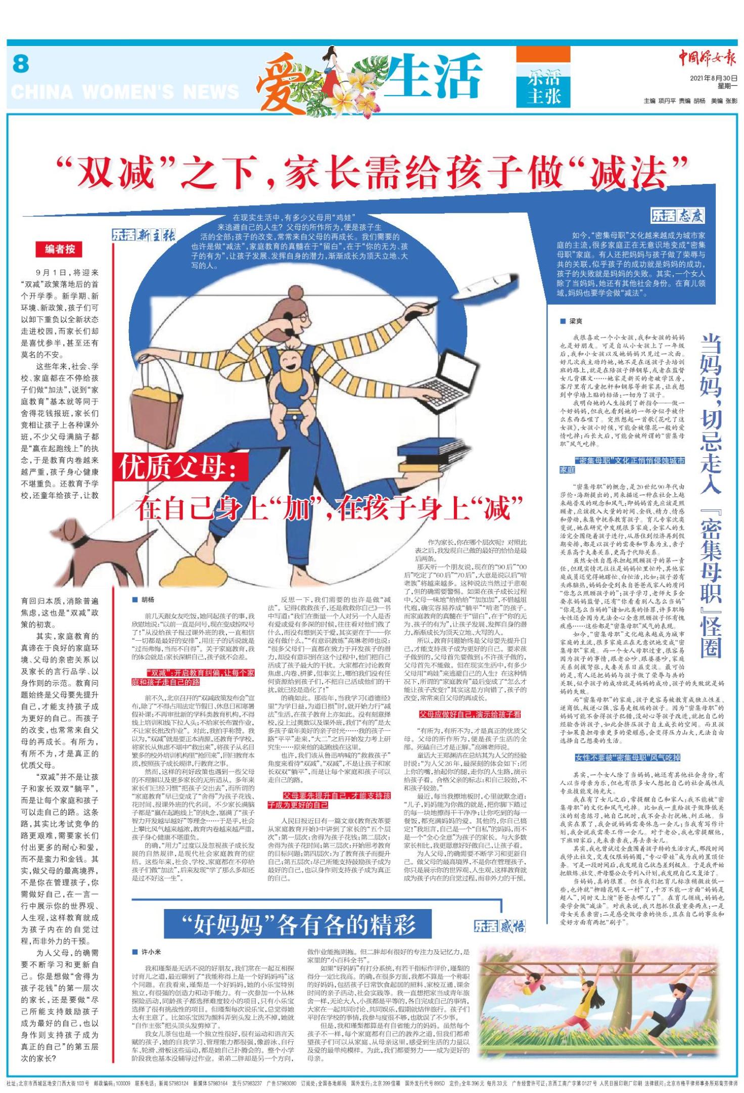《中国妇女报》(电子版)的一切内容(包括但不限于文字、图片、PDF、图表、标志、标识、商标、版面设计、专栏目录与名称、内容分类标准以及为读者提供的任何信息)仅供中国妇女报读者阅读、学习研究使用,未经中国妇女报及/或相关权利人书面授权,任何单位及个人不得将《中国妇女报》(电子版)所登载、发布的内容用于商业性目的,包括但不限于转载、复制、发行、制作光盘、数据库、触摸展示等行为方式,或将之在非本站所属的服务器上作镜像。否则,中国妇女报将采取包括但不限于网上公示、向有关部门举报、诉讼等一切合法手段,追究侵权者的法律责任。