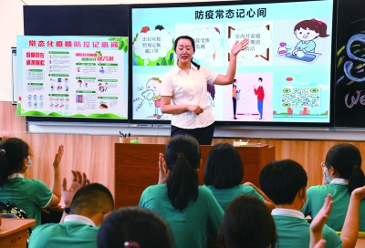 8月29日,青岛通济实验学校九年级老师泮婷为学生上“开学第一课”,教育学生养成良好卫生习惯。