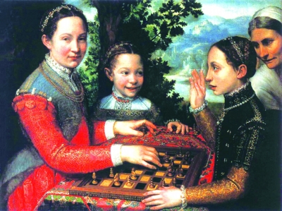 在父权制时代,女艺术家不可能得到教会的委托项目,因此没有机会创作宗教和历史题材的鸿篇巨制。于是安圭索拉在投入肖像画创作的同时,又开创了一种表现生活场景的集体肖像画,后来人们称之为风俗画,因此艺术史上有时也称她为风俗画家。作于1555年的《棋局》就是一幅描绘她3个妹妹日常游戏的集体画像。她的妹妹露西亚和密涅瓦正在对弈,露西亚手执棋盘上权力最大的棋子“王后”微笑着望向画外,似乎已胜券在握;密涅瓦举起右手,神情专注地望着对面的露西亚;观棋的小妹妹欧罗巴则一脸心无城府的笑容,看向略显严肃的密涅瓦;而画面右侧的女家庭教师紧盯棋盘,似乎还在思考着战略战术。细腻的表情传达出每个人的个性,优雅得体的装束表明了姐妹们的高贵身份,画中人物的亲密互动烘托出生动有趣的家庭氛围。同时,安圭索拉借国际象棋这种益智游戏,还表达了另一层意思——女人也可以成为战略上的王者。