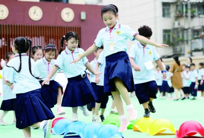 8月29日,在合肥市瑶海区大通路小学,刚刚入学的一年级新生们在参加校园趣味健身运动。当日,该校举行“快乐健身喜迎新学期”一年级新生主题入学式。活动中,通过平衡乌龟壳、动感啦啦操、益智跳格子、活力滚铁环、协作抛接球等趣味健身运动让孩子们了解体育运动,从小养成良好的运动习惯,感受运动健身带来的快乐,迎接小学校园生活。