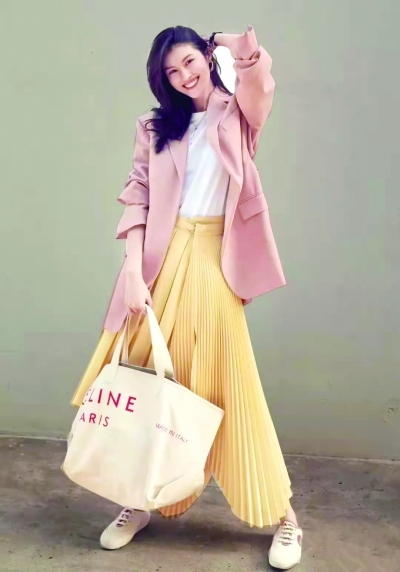 因为褶皱元素本身就很时髦,一般只需用基础色系的百褶裙搭配西服外套,就足以在人群中脱颖而出。或者用百褶裙与西装外套同色系搭配,也是极好的。若是想要更加靓丽缤纷,也可选择彩色或拼色设计的百褶裙来锦上添花,与基础色的极简西装组CP,瞬间令人眼前一亮。而不规则设计的百褶裙和西装外套玩混搭,更彰显个性十足。