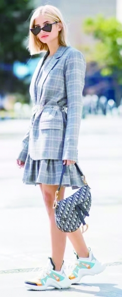 最华贵:西装+缎面裙。西服搭配真丝缎面裙,是早秋时节的“贵气担当”。由于西装外套和缎面裙在质地上泾渭分明,所以用同色系搭配更容易,造型也更有整体感。