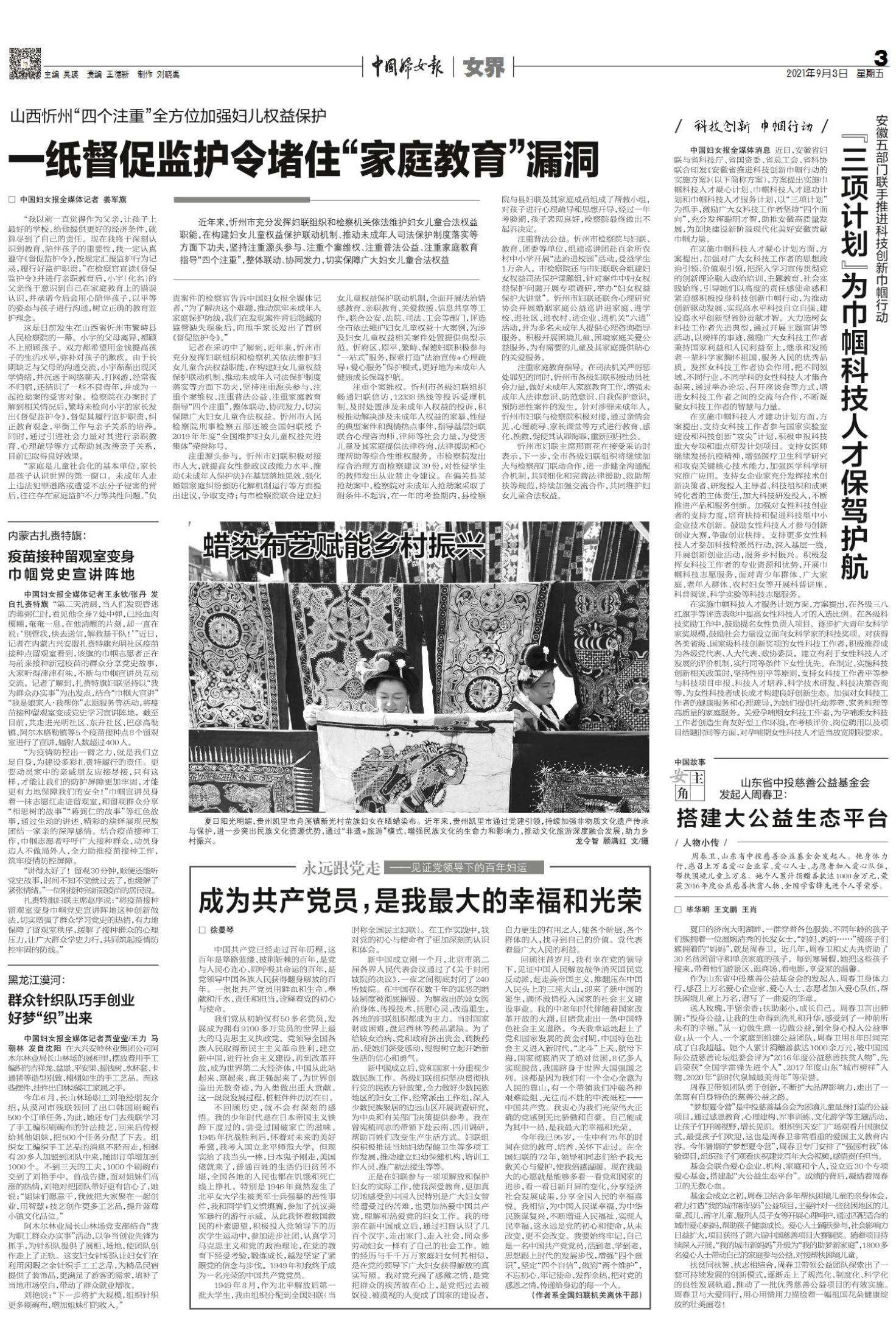 《中国妇女报》(电子版)的一切内容(包括但不限于文字、图片、PDF、图表、标志、标识、商标、版面设计、专栏目录与名称、内容分类标准以及为读者提供的任何信息)仅供中国妇女报读者阅读、学习研究使用,未经中国妇女报及/或相关权利人书面授权,任何单位及个人不得将《中国妇女报》(电子版)所登载、发布的内容用于商业性目的,包括但不限于转载、复制、发行、制作光盘、数据库、触摸展示等行为方式,或将之在非本站所属的服务器上作镜像。否则,中国妇女报将采取包括但不限于网上公示、向有关部门举报、诉讼等一切合法手段,追究侵权者的法律责任。