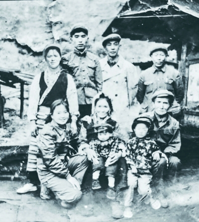 ▲ 作者(前排左一)和新华社记者(后排右一、右二)1980年与红珍一家合影。普赤阿妈(前排左二)怀抱红梅,阿爸(前排右一)怀抱珍华。红珍(后排左一)与弟弟。