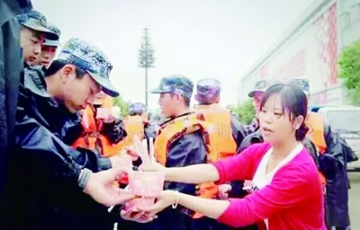 二〇一六年洪水期,武汉市各级妇联组织巾帼志愿者为子弟兵送饭送水。资料图