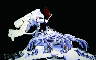 时隔三年,2008年9月27日,当航天员翟志刚身穿“飞天”舱外服打开“神舟七号”飞船舱门,在太空迈出了中国人的第一步,说出太空中的第一句话:“‘神舟七号’向全国人民,全世界人民问好!”时,举国欢腾。通过电视信号,全世界观众都见证了这面由科技人员绣织而成的五星红旗在太空中飘扬。中国也由此成为继美苏后第三个独立掌握空间出舱技术的国家。