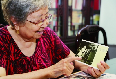 新中国第一代劳模黄宝妹在上海的家中翻看自己做纺织女工时的老照片(6月10日摄)。
