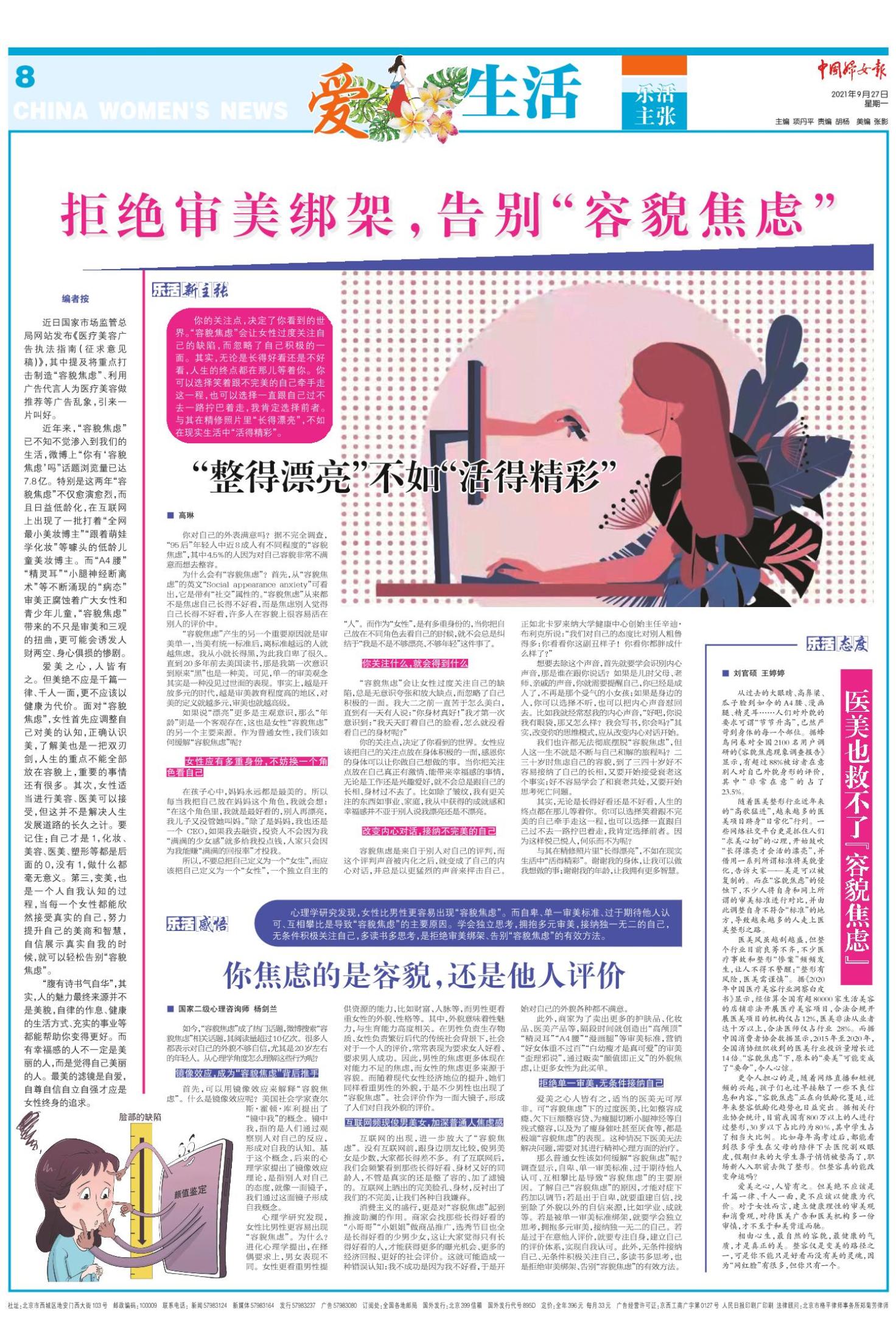 爱美之心,人皆有之。但美绝不应是千篇一律、千人一面,更不应该以健康为代价。面对“容貌焦虑”,女性首先应调整自己对美的认知,正确认识美,了解美也是一把双刃剑,人生的重点不能全部放在容貌上,重要的事情还有很多。其次,女性适当进行美容、医美可以接受,但这并不是解决人生发展道路的长久之计。要记住:自己才是1,化妆、美容、医美、塑形等都是后面的0,没有1,做什么都毫无意义。第三,变美,也是一个人自我认知的过程,当每一个女性都能欣然接受真实的自己,努力提升自己的美商和智慧,自信展示真实自我的时候,就可以轻松告别“容貌焦虑”。