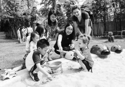 户外,则是以香樟树为中心的大草坪。几步之遥处,是无边玻璃墙泳池、沙坑、鱼塘和蹦床等。有足够的“玩意儿”让孩子们亲近探索大自然。
