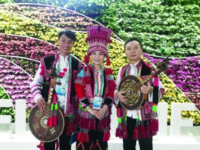 开幕式结束后,来自云南红河州石屏县的李怀秀、李怀福姐弟带领着非物质文化遗产传习所的32位师生在COP15新闻中心门前再次亮嗓,并将海菜腔与花腰彝歌曲《花腰作唱》相融合。