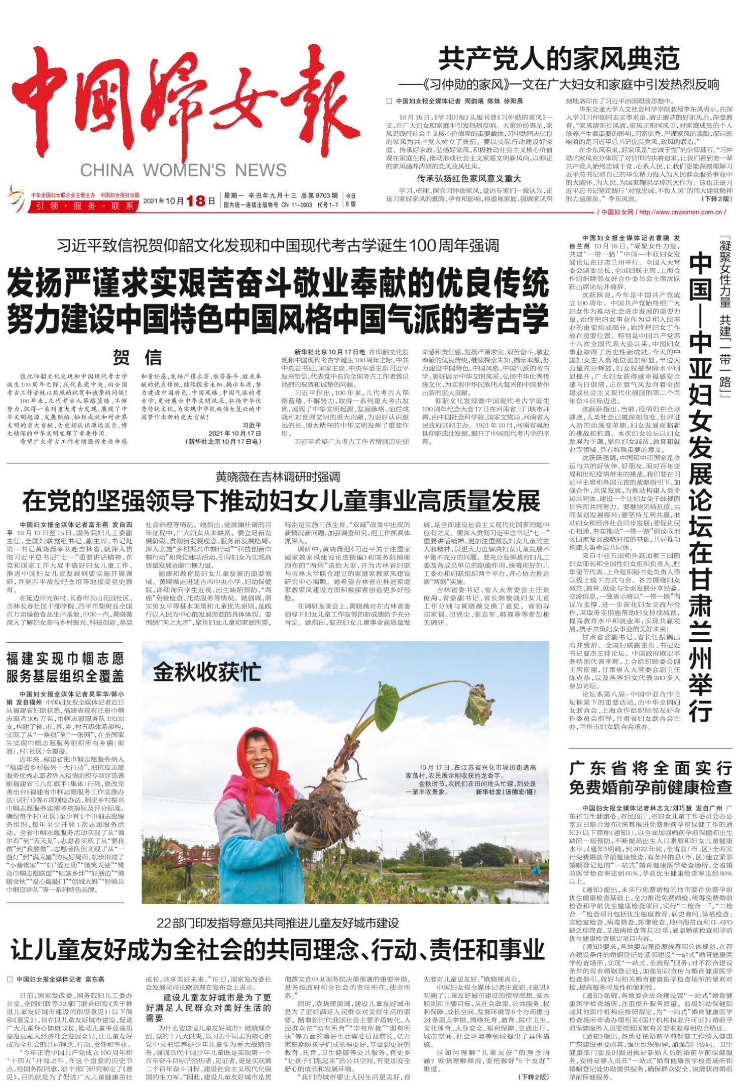 10月15日,《学习时报》头版刊登《习仲勋的家风》一文,在广大妇女和家庭中引发热烈反响。大家纷纷表示,家风是践行社会主义核心价值观的重要载体,习仲勋同志优良的家风为共产党人树立了典范。要以实际行动建设好家庭、 传承好家教、弘扬好家风,积极推动社会主义核心价值观在家庭生根,推动形成社会主义家庭文明新风尚,以醇正的家风涵养清朗的党风政风社风。
