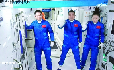 10月16日在北京航天飞行控制中心拍摄的进驻天和核心舱的航天员翟志刚(中)、王亚平(右)、叶光富向全国人民挥手致意的画面。
