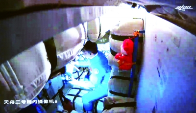 10月17日在北京航天飞行控制中心拍摄的神舟十三号航天员乘组进入天舟三号货运飞船的画面。