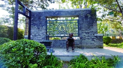 而在离此不远的北海北地铁口,还有一个古典精致的东福寿里“口袋花园”。公园不大,设计精巧。灰色矮墙上方,墨绿色的“福寿里”三个大字周围花纹尽显中式风格,有点儿窗花剪纸的感觉。公园中央还有中式长廊亭,供人们休憩,“福”、“寿”二字同样也点缀在廊亭之间。还有一处铜制景观小品,生动展示了老北京胡同里的生活片段。一个小男孩坐在小凳子上看书,身边放着烧蜂窝儿煤用的铲子、棍子,还有四五块蜂窝儿煤,旁边的火炉上烧着热水……想必很多在胡同里住过的老北京,瞬间都会想起童年的生活场景。