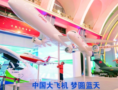 右图:10月21日,在北京展览馆举行的国家“十三五”科技创新成就展上,一名儿童在中国商飞展台观看飞机模型。