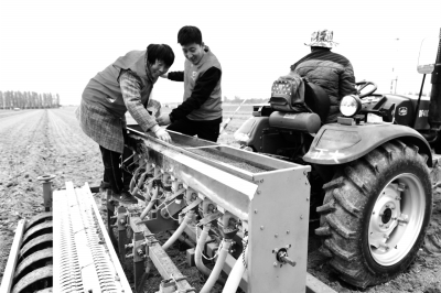 连日来,山东省阳谷县石佛镇党建、技术、农机等部门联合组成党员志愿者助秋突击队,出动人力、物力,帮助困难群众抢收抢种。图为该镇党员志愿者在帮助困难群众抢种小麦。陈清林 郭学勇/摄