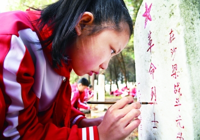 10月21日,小学生在平度烈士陵园为碑文描红。 当日,山东省平度市实验小学组织学生来到烈士陵园,开展“铭记历史 缅怀先烈”主题活动。学生们为革命先烈擦拭墓碑、描红碑文,追忆先烈光辉事迹,珍惜当下美好生活。 新华社记者 李紫恒/摄