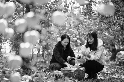 10月27日,游客在岗底村果园整理采摘的苹果。 收获时节,河北省邢台市内丘县岗底村3500余亩标准化种植的苹果进入采摘季,当地果农忙着采收苹果,供应各地市场。 新华社记者 朱旭东/摄