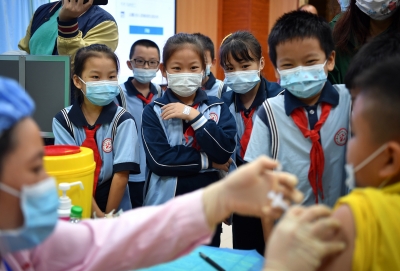 10月28日,海口市琼山第三小学的学生观看同学接种疫苗。 近日,海口市全面启动3到11岁人群新冠疫苗接种工作,医护人员走进校园,为小朋友们接种疫苗。 新华社记者/郭程摄
