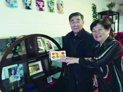 走进河北省秦皇岛市开发区世纪家园吴和平、王晓港的家,客厅里古色古香的博古架上摆放的一幅幅黑白照片、一枚枚勋章和纪念章、一张张荣誉证书等引人注目。