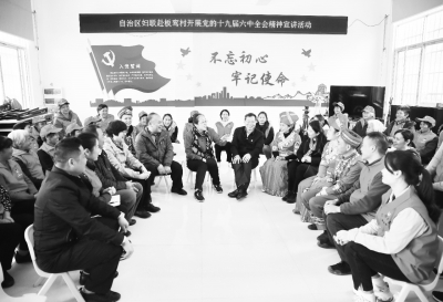 11月15日,广西壮族自治区河池市金城江区五圩镇板鸾村,区妇联主席刘咏梅向基层群众宣讲党的十九届六中全会精神。