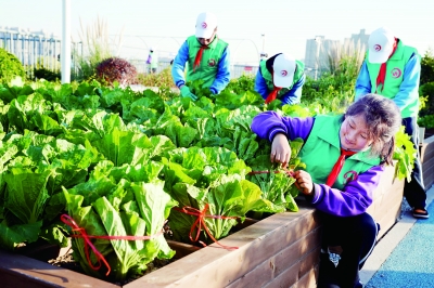 11月24日,进华中学学生在“屋顶生态园”劳动。当日,上海华东师范大学附属进华中学举办“屋顶生态园”劳动教育一周年成果展。一年前,该校在6层楼顶露台修建“屋顶生态园”,作为学生劳动教育课程实践基地。本学期“双减”后,“屋顶生态园”又成为课后服务时间内绿色农艺社团学生们的劳动乐园。 新华社记者 刘颖/摄