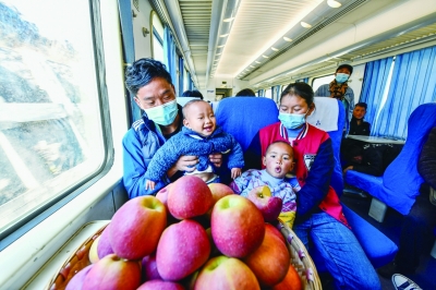 11月30日,来自四川省凉山彝族自治州金阳县的彝族青年比么有呷(左一)与妻儿,乘坐5647次列车至贵州六盘水市转车前往广东省中山市务工。 2002年5月,内昆铁路云南水富至贵州梅花山段建成并投入运营。2003年,贵州贵阳至云南昭通之间开通了一趟逢站必停的5648/5647次绿皮火车。这趟列车平均时速只有40多公里,沿途经停18个乡村小站,全程407公里的长度耗时需9小时31分。这趟穿行在云贵高原上的“慢火车”,是沿线村民出行的重要交通工具,也是云贵两省铁路沿线农产品出山的“致富快车”。 新华社记者 杨文斌/摄