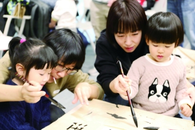 ▲小米Family Day家庭开放日上,员工子女学习书法课程。