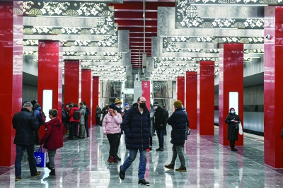 12月7日,在俄罗斯首都莫斯科,乘客走在莫斯科地铁第三换乘环线西南段米丘林大街站内。 12月7日,由中国铁建承建的莫斯科地铁第三换乘环线西南段投入运行。俄罗斯总统普京以视频连线形式出席通车仪式并宣布正式开通。2017年1月,中国铁建中标莫斯科地铁第三换乘环线西南段项目,标段全长5.4公里,包含阿明耶沃站、米丘林大街站、韦尔纳茨基大街站3个车站和9条盾构隧道建设任务,这也是俄罗斯首次在地铁施工领域引进中国企业。走进米丘林大街地铁站,红色立柱、团寿纹、祥云等中国元素随处可见。这里已经成为中俄友谊的新地标,展现出“一带一路”上的跨文化盛景。 新华社发(叶甫盖尼·西尼岑/摄)