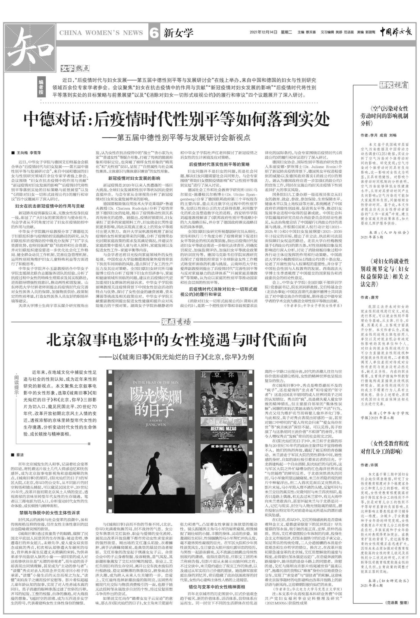 近日,“后疫情时代与妇女发展——第五届中德性别平等与发展研讨会”在线上举办,来自中国和德国的妇女与性别研究领域百余位专家学者参会。会议聚焦“妇女在抗击疫情中的作用与贡献”“新冠疫情对妇女发展的影响”“后疫情时代将性别平等落到实处的目标策略与前景展望”以及“《消除对妇女一切形式歧视公约》的履行和审议”四个议题展开了深入研讨。