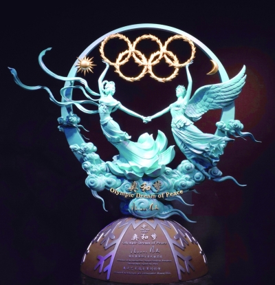 这是一尊奥运和平之礼。《奥运圣火》雕塑表现了历经三千年风雨的古希腊胜利女神在北京涅槃新生为奥运女神,高擎奥运和平圣火、托起和平鸽与橄榄枝,玉立于象征和平美好的荷花之上,犹如一束呼唤世界各国同舟共济、团结抗疫的希望之光,将照亮人类走出新冠疫情的黑暗隧道,迎接冰雪之约,奔向美好未来。这也是一尊奥运精神之礼。雕塑大理石基座上铭刻着国际奥委会主席巴赫签名的奥林匹克新格言“更快、更高、更强、更团结”。