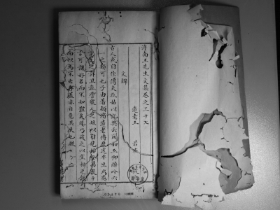 我在修复金朝大文人王若虚的著作《滹南遗老王先生文集》时,这本被虫蛀的古籍打开后是一个很对称的图案,看起来很漂亮,但修起来却很麻烦。