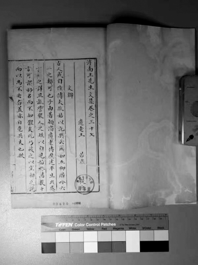 《滹南遗老王先生文集》是清朝的版本,也是难得一见的手抄本。这卷古籍具有重要的历史资料价值和版本价值,并已在2010年入选了《国家珍贵古籍名录》。刚拿到手时,整个书非常不平整,弯弯曲曲的满是虫蛀痕迹,一张张的粘连在一起,难以分开。我当时拿到手后第一步是拍照。拍完照片以后,取了这本书的一些碎片送去国家图书馆的纸浆纤维检测中心做检测,检测纸张的纤维配比,选出一个最相近的纸来做修复。